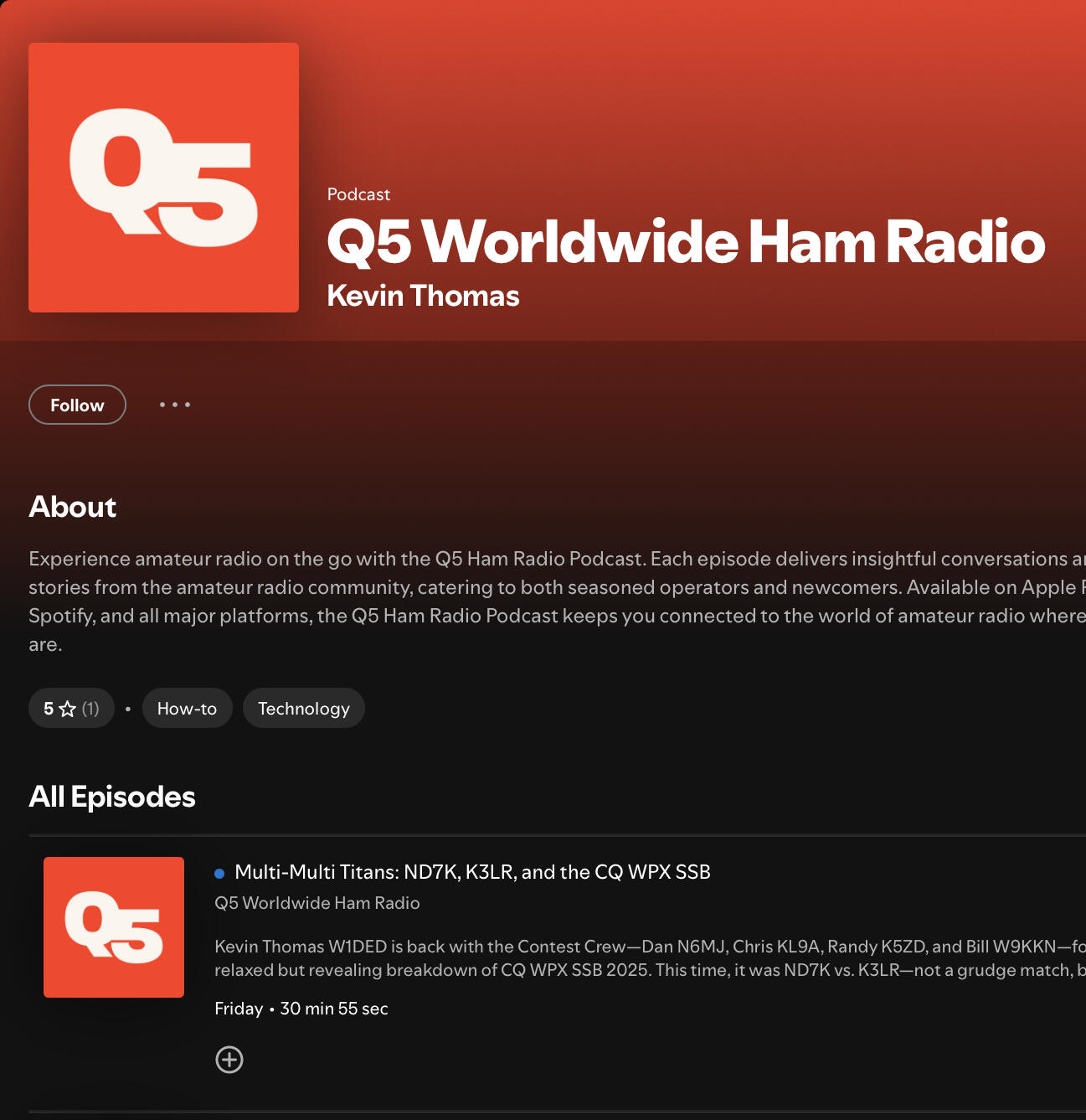 Experience amateur radio on the go with the Q5 Ham Radio Podcast. Each episode delivers insightful conversations and stories from the amateur radio community, catering to both seasoned operators and newcomers. Available on Apple Podcasts, Spotify, and all major platforms, the Q5 Ham Radio Podcast keeps you connected to the world of amateur radio wherever you are.
